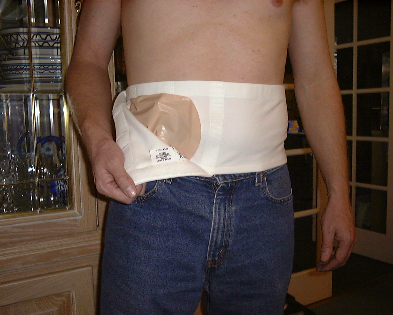 With your pouch attached in a sideways (horizontal) position you will step in to the belt and pull it up into position over your stoma. Open the flap securing the pocket area and let it hang down allowing free access to the inside of the pocket. Bring the tail end of your pouch through the hole on the inside of the belt pocket area which is over your stoma (and where your pouch is attached). Then simply arrange your pouch to fit within the pocket.